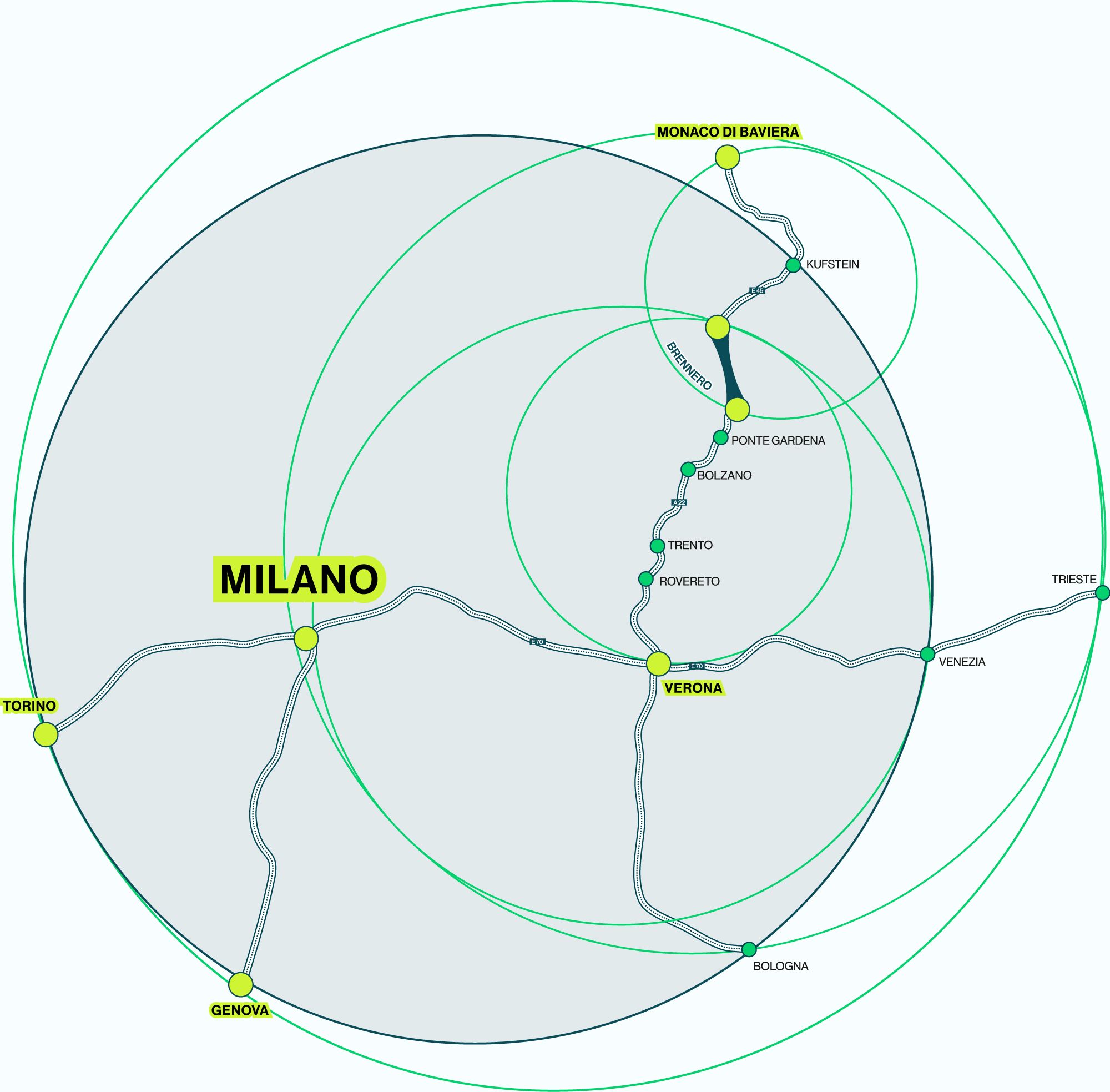 Cuore del progetto è il Tunnel di Base del Brennero, una galleria ferroviaria di circa 64 km che unirà Monaco al nord Italia, definendo una nuova centralità per Verona e Milano, già inserita nei corridoi Algeciras-Budapest e Rotterdam-Genova.